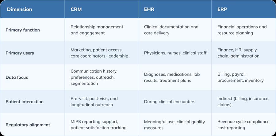 Your practice likely already uses an electronic health record (EHR) system and possibly an enterprise resource planning (ERP) system for billing and operations. Understanding where CRM fits alongside these systems helps clarify why it complements, rather than replaces, what you already have.
